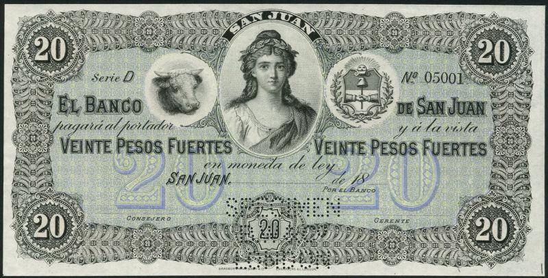 (†) El Banco de San Juan, Argentina, specimen 20 pesos fuertes, San Juan, 18- (1876), serial number D 05001, black and green, Liberty top centre, bull to her left, arms to her right, reverse green and brown, head of Liberty in field