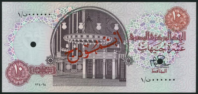 Central Bank of Egypt, specimen 5 pounds, ND (type of 1989), blue, the Ibn Toulon Mosque at centre, specimen 10 pounds, ND (type of 1978), brown and multicoloured, the Al-Rifai Mosque at centre, signature 15