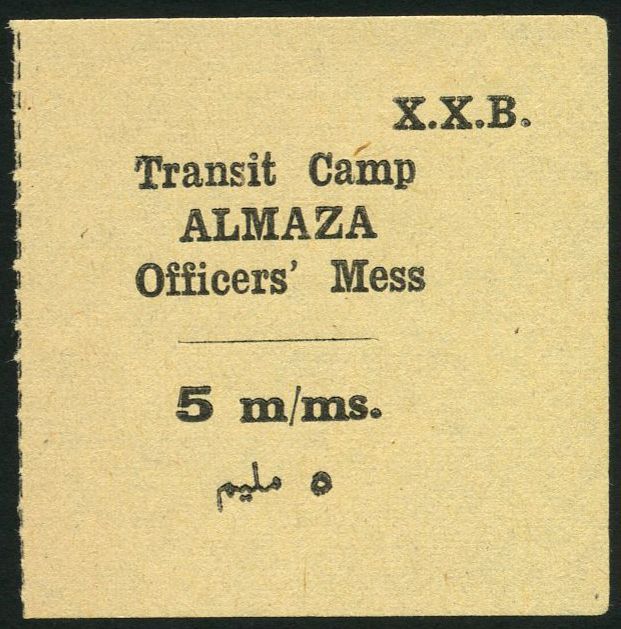 Officers Mess, Transit camp, Egypt, chits for 1 millieme, black text on pale yellow paper, 1 piastre (2), black text on pink paper all with text 'TRANSIT CAMP ALMAZA Officers Mess'