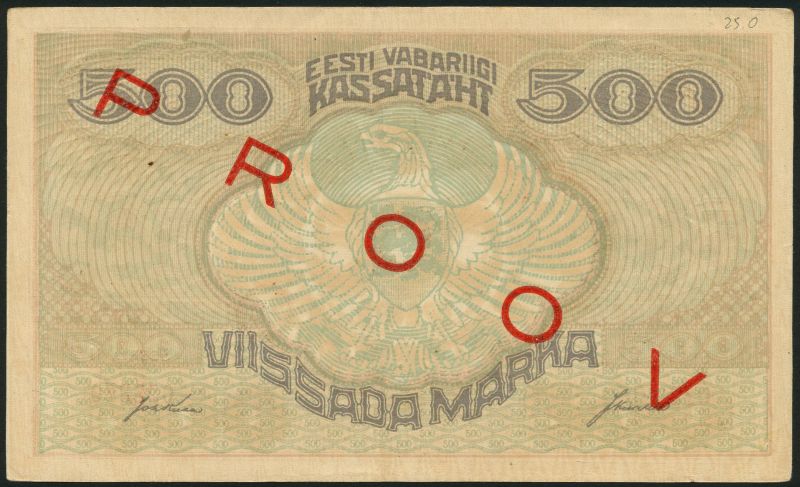 Treasury note, Estonia, specimen 500 marka, ND (1920), serie II, red serial number 023380, pale blue and mauve, eagle and shield at centre, reverse pale blue and mauve, also another example with red serial number A 502873