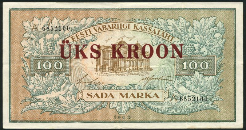 Treasury note, Estonia, 100 marka, 1923 (1928 Provisional issue), serial number A 6852100, pale brown and green, maroon overprint UKS KROON, bank building at centre, also specimen 25 marka, 1922, mauve and green, red PROOV overprint and an Exchange note for 10 krooni, 1940, serial number B-1717678, blue, girl at left in National dress and holding a corn sheaf and scythe