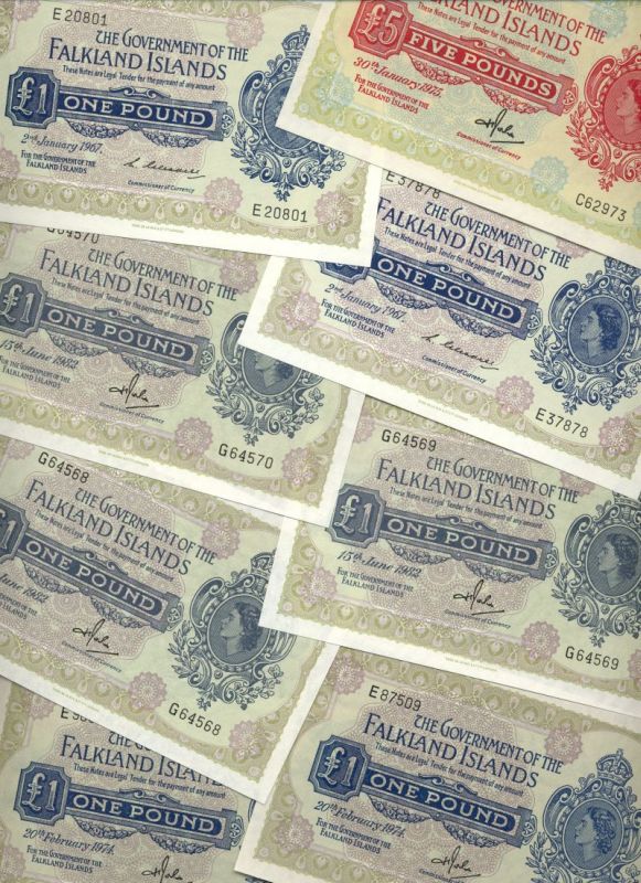 (x) Falkland Islands Government issue, £1 (7), 1967 (2),1974 (2),1982(3), blue and pale green and mauve, Elizabeth II at rigt, value left centre, also a £5, 30 January 1975, red and green and pale blue, Elizabeth II at right, value left centre, Rowlands signature
