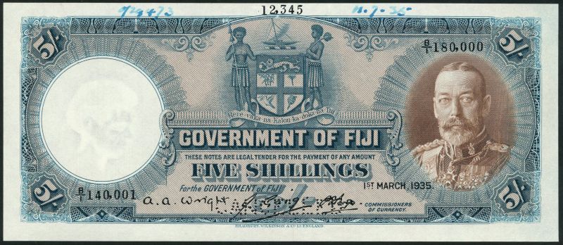 (†) Government of Fiji, specimen 5/-, 1 March 1935, serial number B/1 180,000, blue on blue and brown underprint, George V at right, arms at top centre, value at low centre and each corner, reverse multicolour