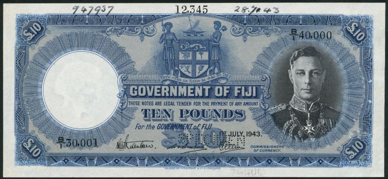 (†) Government of Fiji, printer's archival specimen £10, 1 July 1943, serial number run B/1 30,001 to B/1 40,000, black and blue on grey underprint, King George VI at right, arms at top centre, reverse ornate guilloches, signatures Robertson, Banting, Allen, perforated SPECIMEN
