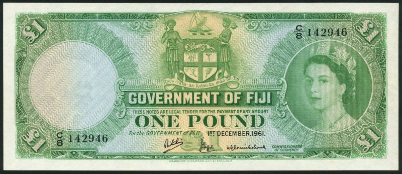 (x) Government of Fiji, £1, 1 December 1961, serial number C/8 142946, Ritchie, Griffiths and Cruickshank signatures, green on yellow and blue underprint, Queen Elizabeth II at right, arms at upper centre, reverse denomination at centre and in all four corners