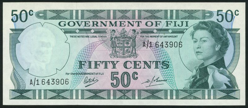 Government of Fiji, 50 cents, dark green, $1, brown, and $2, green, Elizabeth II at right, arms at centre, Ritchie and Barnes signatures also Central Monetary Authority $1, brown, $2, green and $5, orange, all Elizabeth II at right, arms at centre, the $2 Barnes Craik, the $1 and $5 Barnes Earland signatures