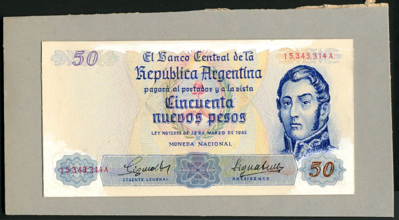 El Banco Central de la Republica Argentina, an obverse composite essay on board for a 50 centavos, blue, Moreno at right, 5 pesos, green, Planes at right and 50 pesos, 1962, blue, General Jose de San Martin at right, cap of Liberty at centre