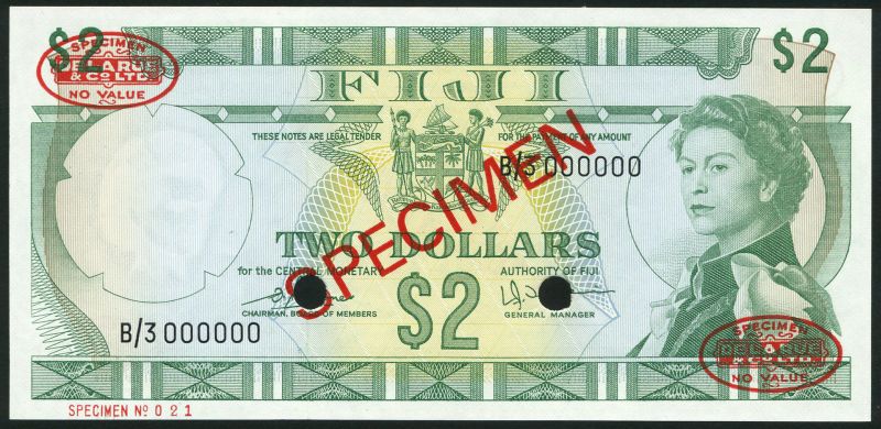 (†) Central Monetary Authority, a group of specimens of the ND (1974) Issue, all zero serial numbers, comprising $1, prefix B/2, brown and pale green; $2, prefix B/3, green and pale blue; $5, prefix A/5,orange and pale mauve, $10 , prefix, A/6, purple and orange, all Barnes and Tomkins signatures, Queen Elizabeth II at right, arms at upper centre, reverse denomination in geometric pattern, all overprinted SPECIMEN in red with two De La Rue Specimen ovals on obverse and reverse, two punch holes