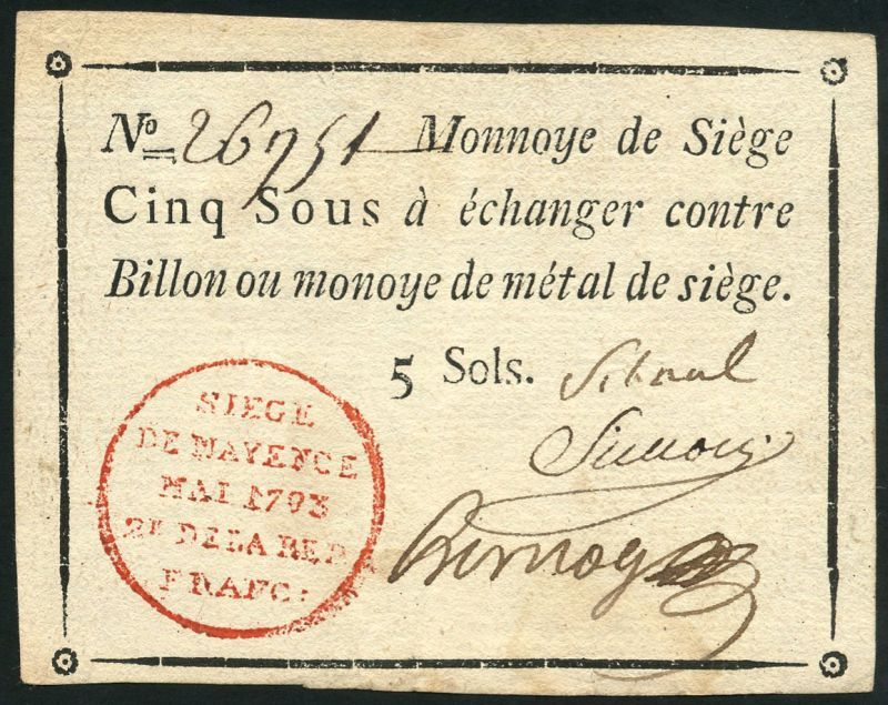 Siege of Mayence, Germany, 5 sols, May 1793, serial number 26751, black text on parchment like paper, red circular seal low left, manuscript signatures low right, also an example with printed signatures and serial number 64789