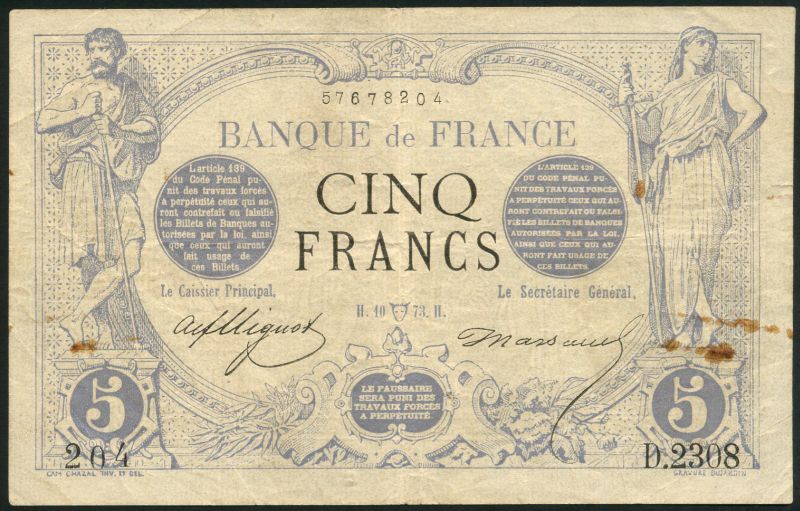 (x) Banque de France, 5 Francs, 10 April 1873, series D.2308 number 204, blue, man at left, maiden at right, reverse three allegorical figures