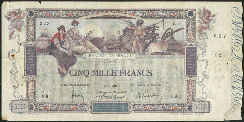 Banque de France, 5000 francs, 7 January 1918, serial number V.5-323, purple, pale blue and nmulticoloured, 'Flameng', allegorical figures and symbols top centre, Picard, Frachon and Laferrier signatures, reverse purple and pale blue, allegorical figures