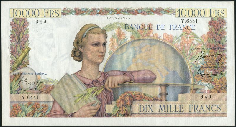 Banque de France, 10000 francs, 7 January 1954, serial number Y.6441-349, multicoloured, 'Genie Francais', ornate border of foliage, Gargam, D'ambrieres and Belin signatures, reverse multicoloured, young man at centre (Architecture), value top left and right