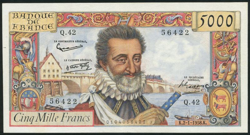Banque de France, 5000 francs, 2 January 1958, serial number Q.42-56422, blue, red and multicoloured, 'Le Pont Neuf' at centre, Henri IV at centre, D'Ambrieres, Favre-Gilly and Gargam signatures, reverse red and multicoloured, Henri IV and the Chateau de Pau