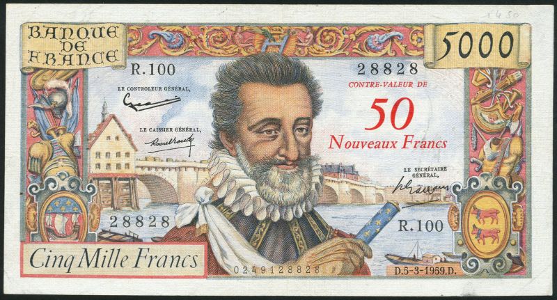 Banque de France, 50 NF red overprint on 5000 francs, 5 March 1959, serial number R.100-28828, blue, red and multicoloured, 'Le Pont Neuf' at centre, Henri IV at centre, D'Ambrieres, Tondu and Gargam signatures, reverse red and multicoloured, Henri IV and the Chateau de Pau