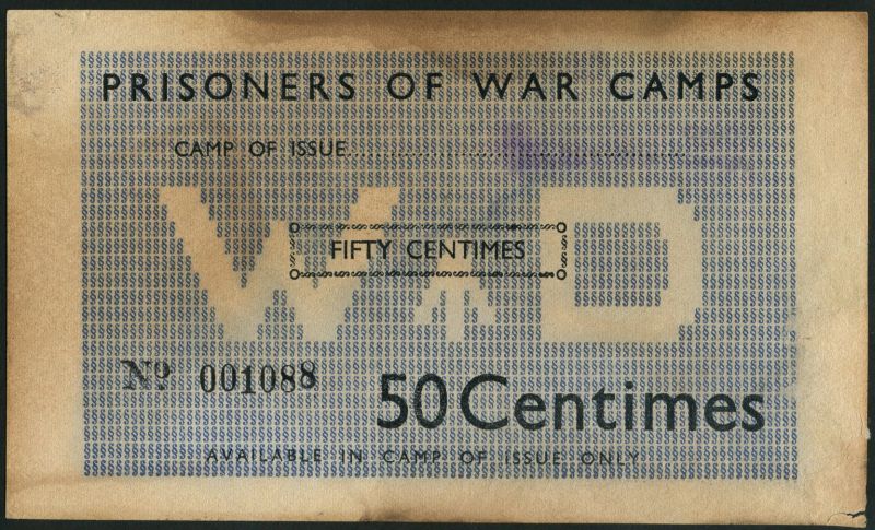 Prisoner of War Camp money for use in France, an part issued group of notes comprising 50 centimes, blue, 2 1/2 francs, salmon, 5 francs, pink and 10 francs, brown, all ND (1944), all serial numbers low left, all white WD (War Department) in underprint at centre