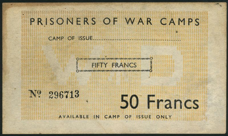 Prisoner of War Camp money for use in France, a part issued 50 francs, ND (1944), serial number 296713, pale orange-yellow, white WD (War Department) in underprint at centre