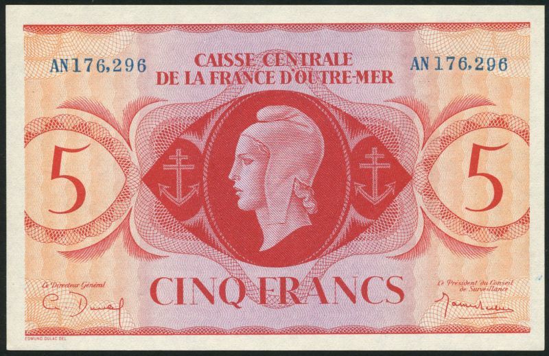 Caisse Centrale de la France d'Outre-Mer, 5 francs, L.1941, serial number AN 176,296, red on pink and orange underprint, Marianne at centre, flanked by anchors, value at left and right