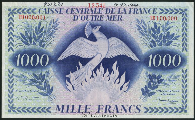 (†) Caisse Centrale De la France D'Outre-Mer, specimen 1000 francs, ND (1944), red serial number TD 000001-100000, blue and multicoloured, phoenix arising from the flames at centre, Postel-Vinay signature, reverse blue, allegorical scenes of war and peace at left and right