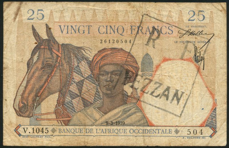 Banque de l'Afrique Occidentale, French Occupation of The Fezzan, 5 Francs, ND (old date 10 March 1938), multicoloured, man at centre, reverse man weaving; 25 Francs, ND (old date 9 March 1939), multicoloured, man and horse, reverse lion, both overprinted R - F FEZZAN in black