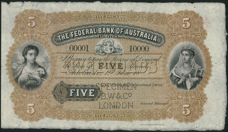 (†) Federal Bank of Australia Limited, specimen £5, Adelaide, 1 June 18-, serial number 00001-10000, black and brown, arms top centre, maiden with lamb at left, turreted maiden at right, value at centre and at each corner, reverse pink and brown, value