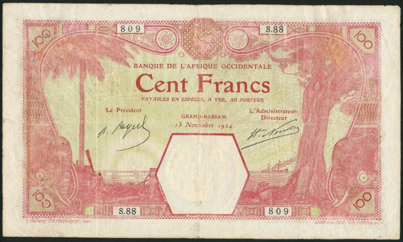 Banque de l'Afrique Occidentale, 100 Francs, Grand-Bassam, 13 November 1924, serial number S88 809, red and green, elephant head and tree at left and right, reverse language panels
