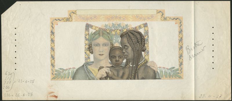 Afrique Francaise Libre (French Equatorial Africa), partial reverse proof on large format thin paper for a 1000 francs, ND (1941), multicoloured, French woman with African woman and child at centre, note text absent