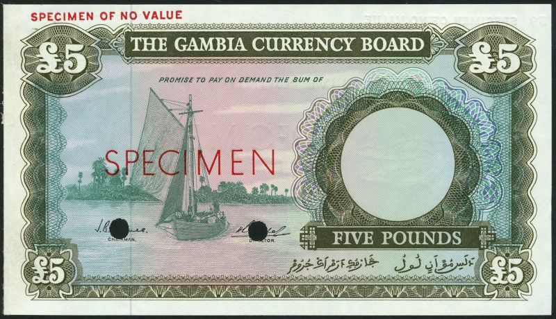 Currency Board, Gambia, colour trial £5, ND (1965), no serial numbers, olive and multicoloured, sailing boat at left, reverse olive