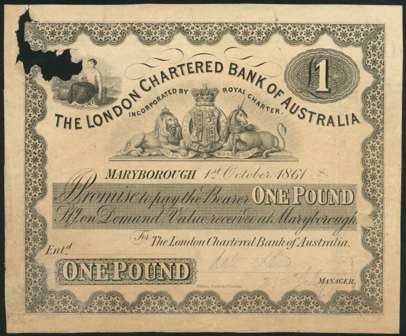 (x) London Chartered Bank of Australia, proof £1, 1 October 1861, black and white, Royal arms top centre, maiden top left, value top right