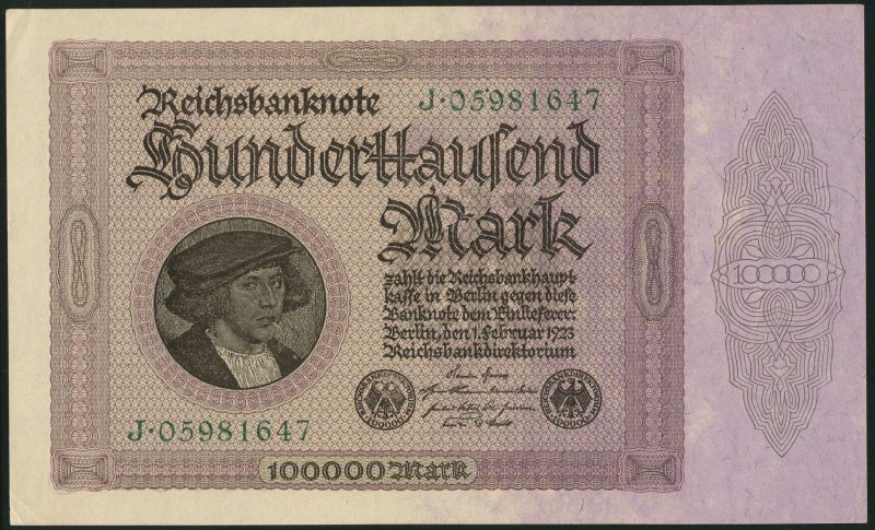 (x) Reichsbanknote, Germany, 100,000 mark (3), 1 February 1923, green serial numbers, black and lilac, Gisze at left