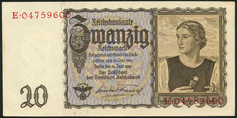 Reichsbanknote, 10 mark, 1929 (1945), dark green, Thaer at left, ornament watermark at left, also 20 mark, 1939, brown, woman at right and 5 mark, 1942, purple, man at right