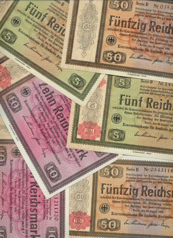 Conversion Fund for german foreign DebtForeign Debts (Konversionkasse), 5 mark (2), green, 10 mark (2), pink-purple, and 50 mark (2), all dated 28 August 1933 but one set with pink-red 1934 in guilloche at left