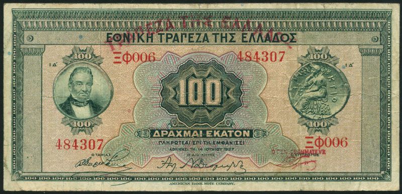 (x) Bank of Greece, 100 Drachmai, ND (old date 6 June 1927), green on orange and brown underprint, Stavros at left, coin at right, red overprint with new bank name, reverse coin with Apollo at centre; Ministry of Finance, 2 Drachmai, 27 October 1917, blue and multicoloured, Zeus at left, reverse green, arms at upper centre