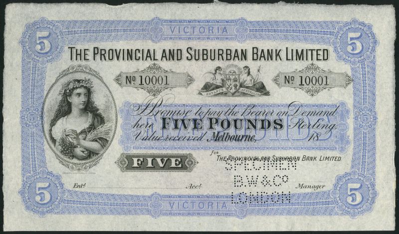 (†) The Provincial and Suburban Bank Limited, specimen £5, Melbourne, 18-. blue and white with black text, maiden (ceres) at left, arms top right centre, value at centre and at each corner, reverse blue and lilac, medallic female head at left and right, value at centre