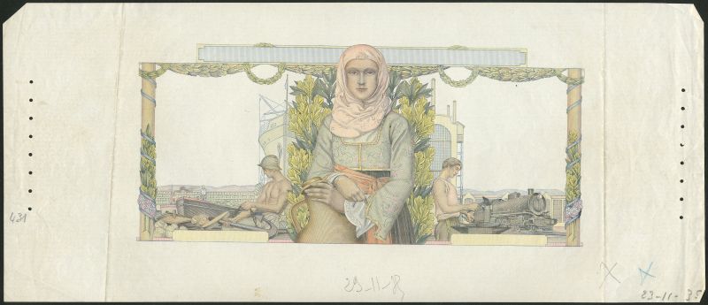 Bank of Greece, partial reverse proof on large format paper for a 1000 drachmai, ND (1935), multicoloured, girl in national costume at centre, sailor with anchor and boats at left, blacksmith and steam train at right