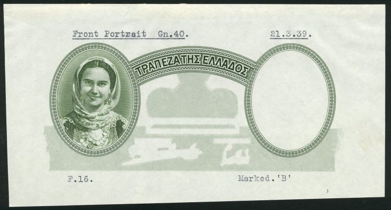 (†) Bank of Greece, a selection of partial proofs and background details for the issue of 1939 comprising partial obverse 500 drachmai (3), one green, one red and one violet, two with girl at left and two partial reverses, one green, one blue, also various backgrounds (5)