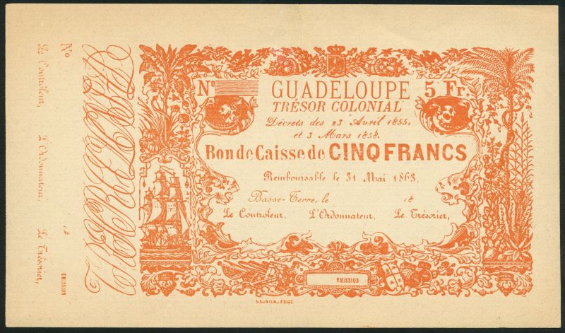 Tresor Colonial, Guadeloupe, proof 5 francs, 31 May 1863, orange on cream paper, ship at left, ornate border around