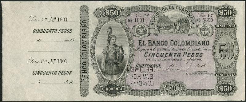 (†) El Banco Colombiano, printer's archival specimen 50 Pesos with counterfoil, ND (ca1885), serial number run 1801 to 5800, black on lilac underprint, soldier with spear, shield and liberty cap at left, vignette of harvesting at top centre, arms of Guatemala and Colombia on either side, reverse value in ornate guilloche, perforated SPECIMEN BW & CO LONDON