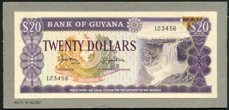 (†) Bank of Guyana, an obverse composite essay on board for a $5, 1962, green and multicoloured, also an obverse and reverse composite essay on board for a $20, 1962, both serial number 123456, arms at left, Kaiteur falls at right, reverse of the $20 logging scenes