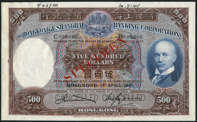 (†) Hong Kong and Shanghai Banking Corporation, specimen 500 dollars, 1 April 1941, serial number C 000000, purple-brown and multicoloured, Sir Thomas Jackson at right, arms top centre, signature of V.M.Grayburn low right, reverse blue and white, veiled head of Ceres at left, bank building at centre