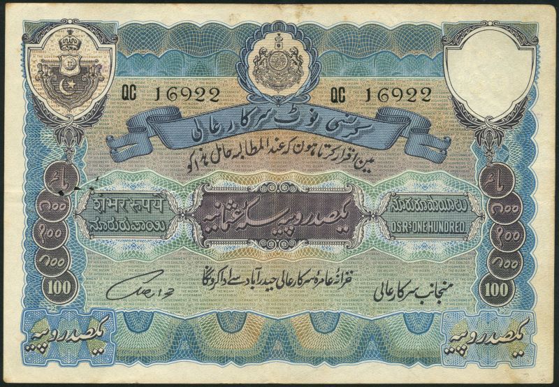 Hyderabad Government Issue, 100 Rupees, ND (1938-41), serial number QC 16922, signature D. Fakhr-Yar Jung, blue and multicoloured underprint, arms upper left and centre, value in panels at left, centre and right, reverse value in ornate guilloche at centre
