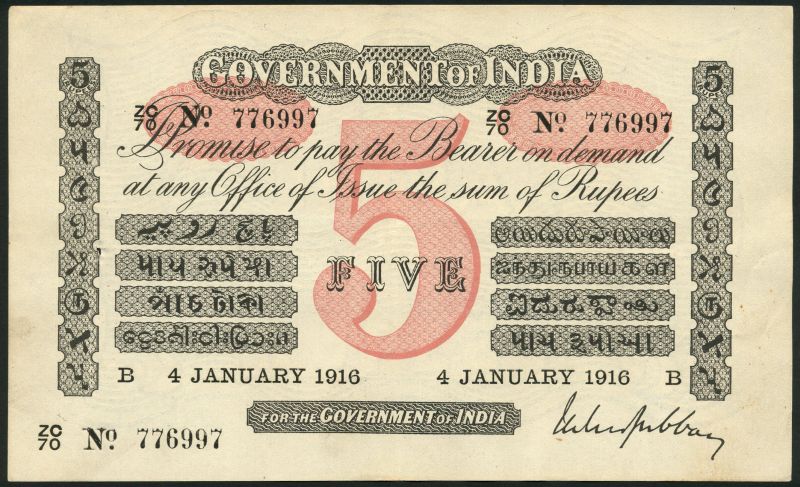 Government of India, 5 rupees, Bombay, 4 January 1916, serial number ZC/70 776997, black and white, value in pale pink-red at centre, B low left and right, Gubbay signature low right