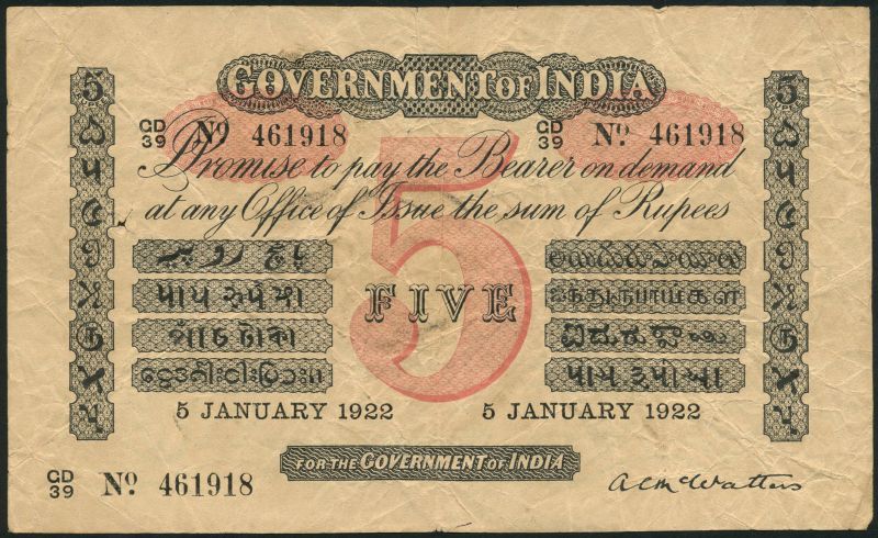 (x) Government of India, 5 Rupees, 5 January 1922, without letter for city of issue, serial number CD/39 461918, signature A. C. McWatters, black on pink underprint, value in pink at centre, uniface
