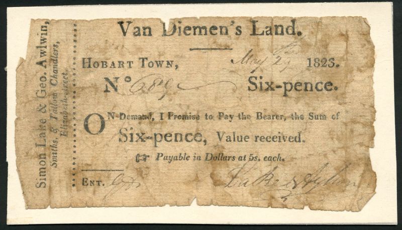 (x) Van Diemen's Land, Lake and Awlwin, 6D (2), Hobart Town, 1823, black and white, one Lake and Awlwin signatures, the other indistinct,