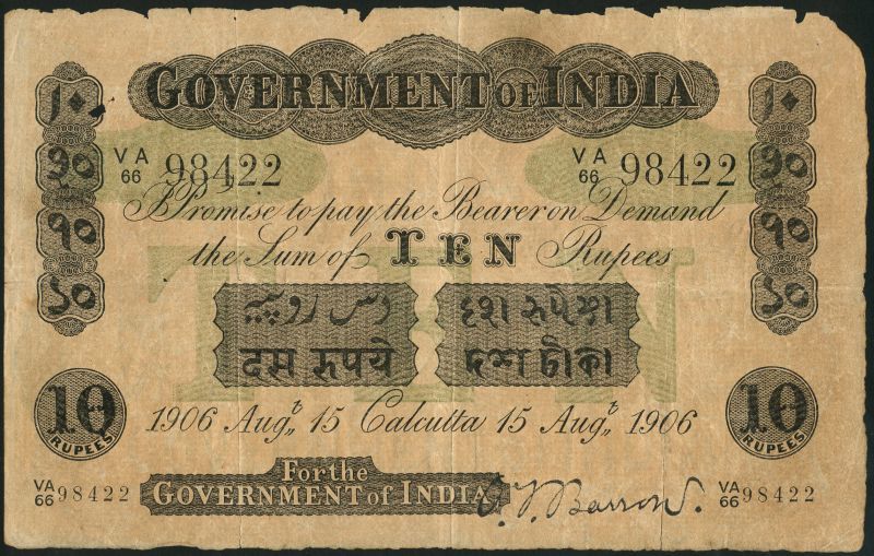 (x) Government of India, 10 Rupees, Calcutta, 15 August 1906, serial number VA/66 98422, signature O. T. Barrow, black on green underprint, value at centre, uniface