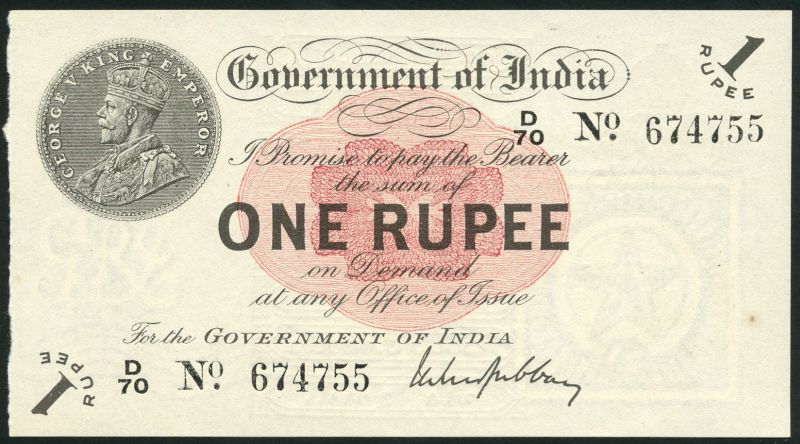 (x) Government of India, 1 rupee, ND (1917), serial number D/70 674755, black and white, pink central guilloche, George V 1 rupee coin top left, Gubbay signature