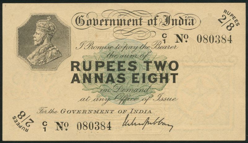Government of India, 2 rupees and 8 annas, Calcutta, ND (1918), serial number C/1 080384, black and white with blue-green central guilloche, head of George V top left, Gubbay signature, reverse text, value top right, Royal monogram top left