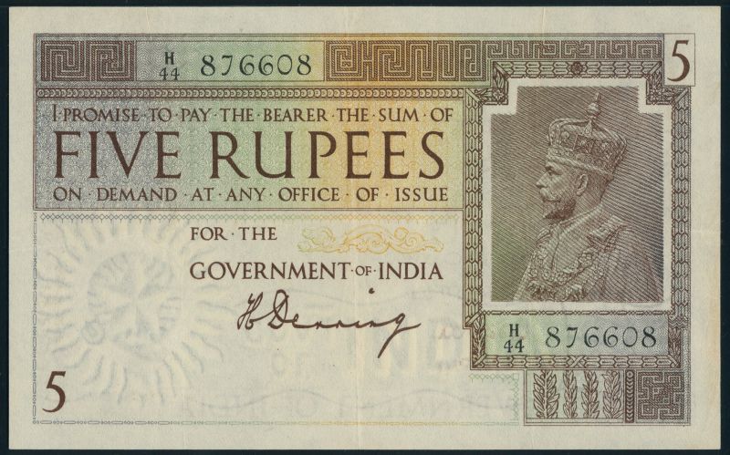(x) Government of India, 5 rupees, ND (1917-1930), serial number H/44 876608, purple, white, green and orange, George V at right, Denning signature, reverse purple and pale green and orange