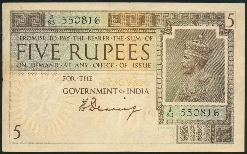 (x) Government of India, 5 Rupees, ND (1925), serial number J/83 550816, signature H. Denning, brown-violet, green and light brown, King George V at upper right, reverse value at upper right and in eight languages at left