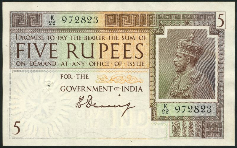 Government of India, 5 rupees, ND (1925), serial number K/22 972823, white, purple, pale green and orange, George V at right, Denning signature