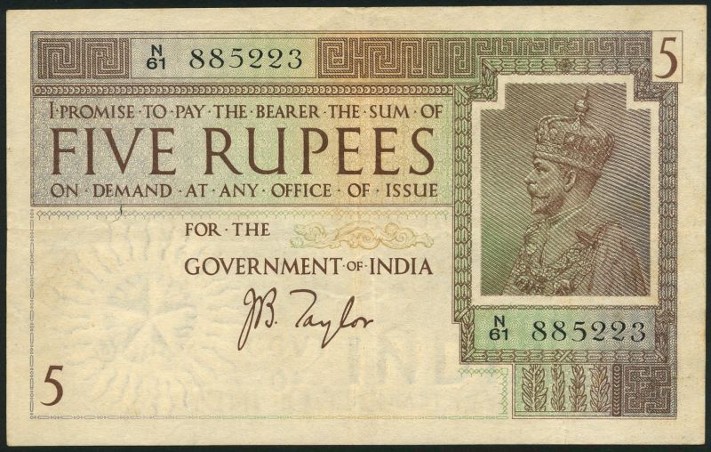 Government of India, 5 Rupees, ND (1925-30), serial number N/61 885223, signature J. B. Taylor, brown-violet, green and light brown, King George V at upper right, reverse value at upper right and in eight languages at left